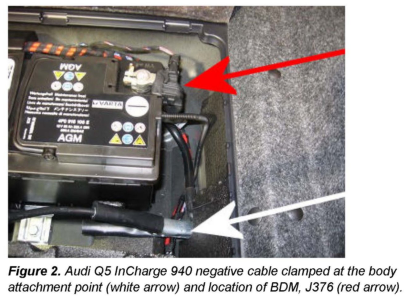 2. Connect the negative cable clamp to the vehicles negative battery cable downstream at the body attachment point. (Figures 1 and 2 illustrate this on an Audi Q5.)