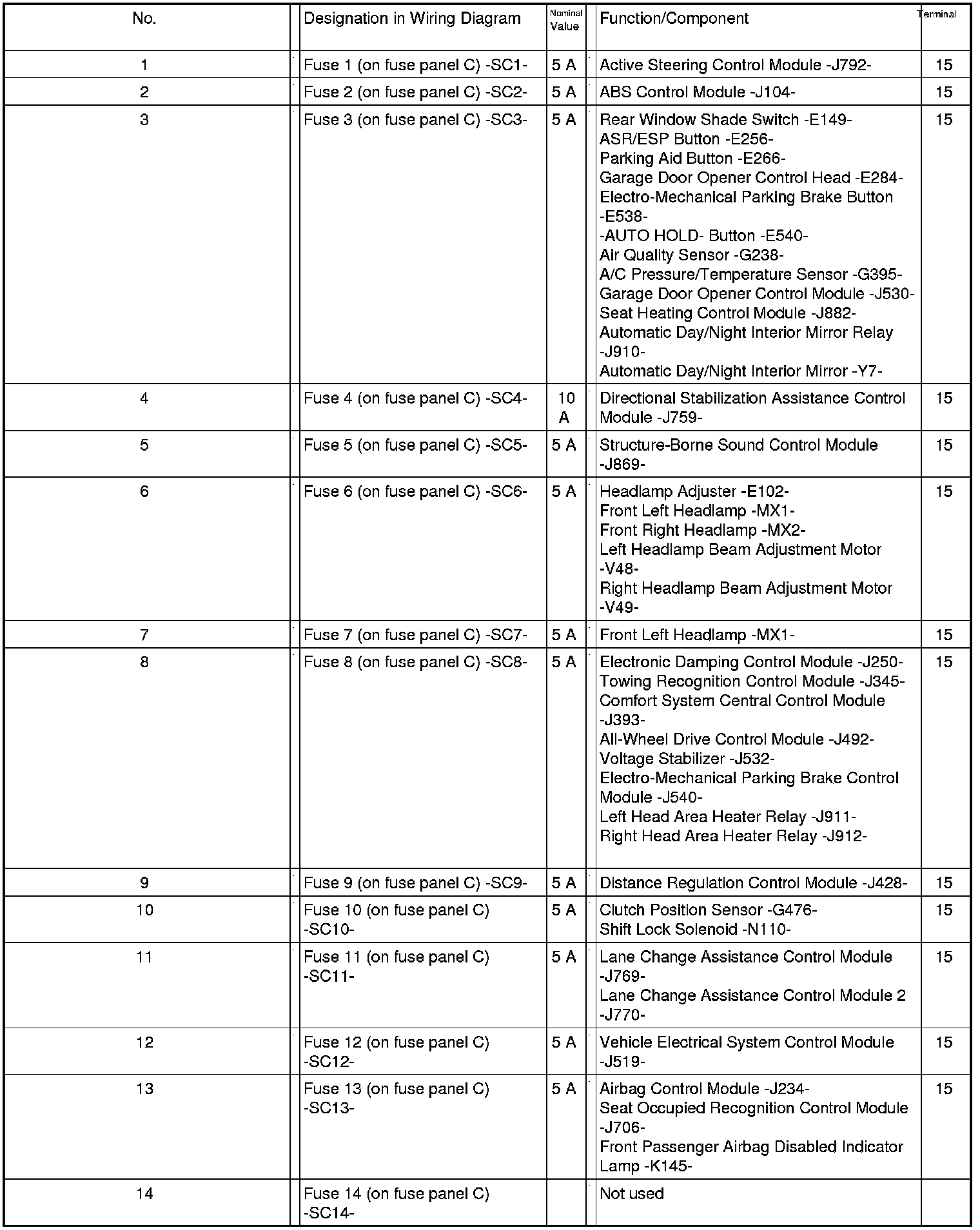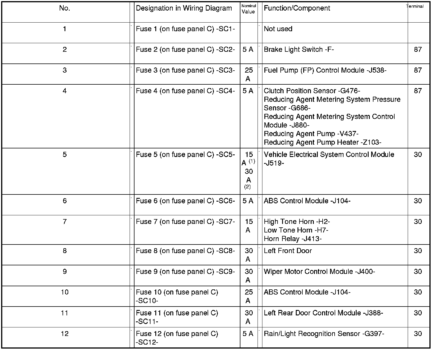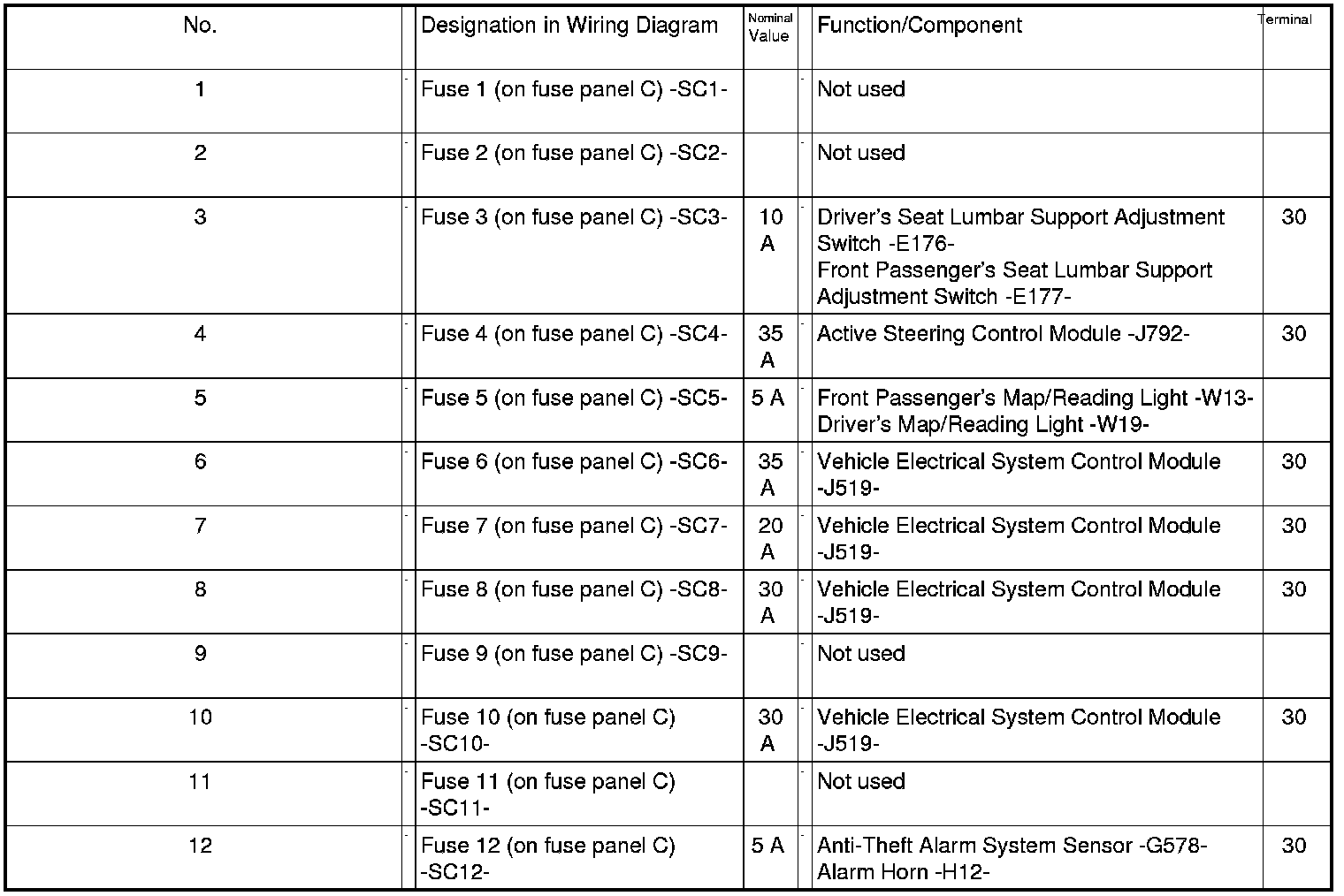 Fuse Panel C -SC- From August 2011