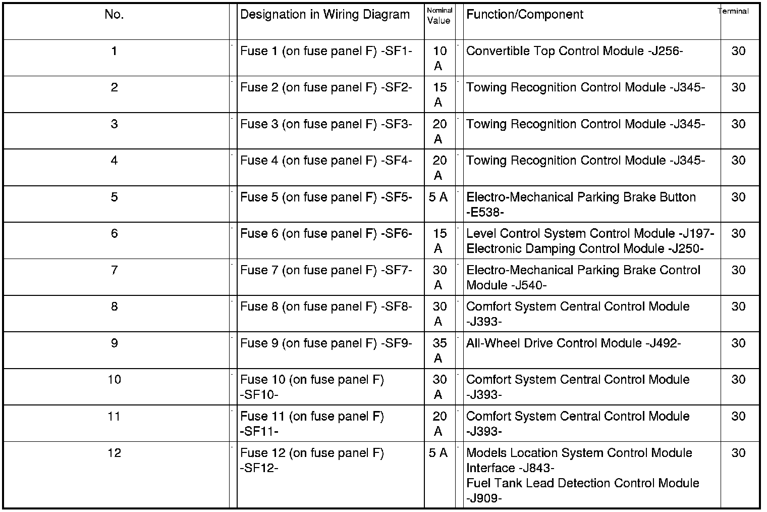 Relay /Fuse Panel F -SF- from August 2011