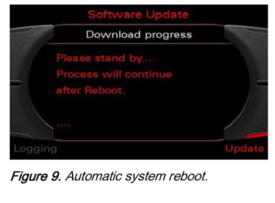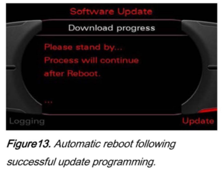 It may be necessary to reboot the system during the update programming session. This is carried out automatically and does not require the user to take action. Once the system has rebooted, updating is continued and the "Download progress" screen is displayed. The MMI screen retracts on vehicles equipped with folding display units.