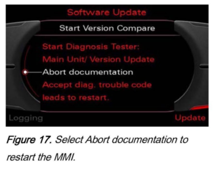 23. After a successful update and before Software Version Management (SVM) requires feedback documentation, the MMI must be restarted. Select Abort documentation and the system will reboot automatically.