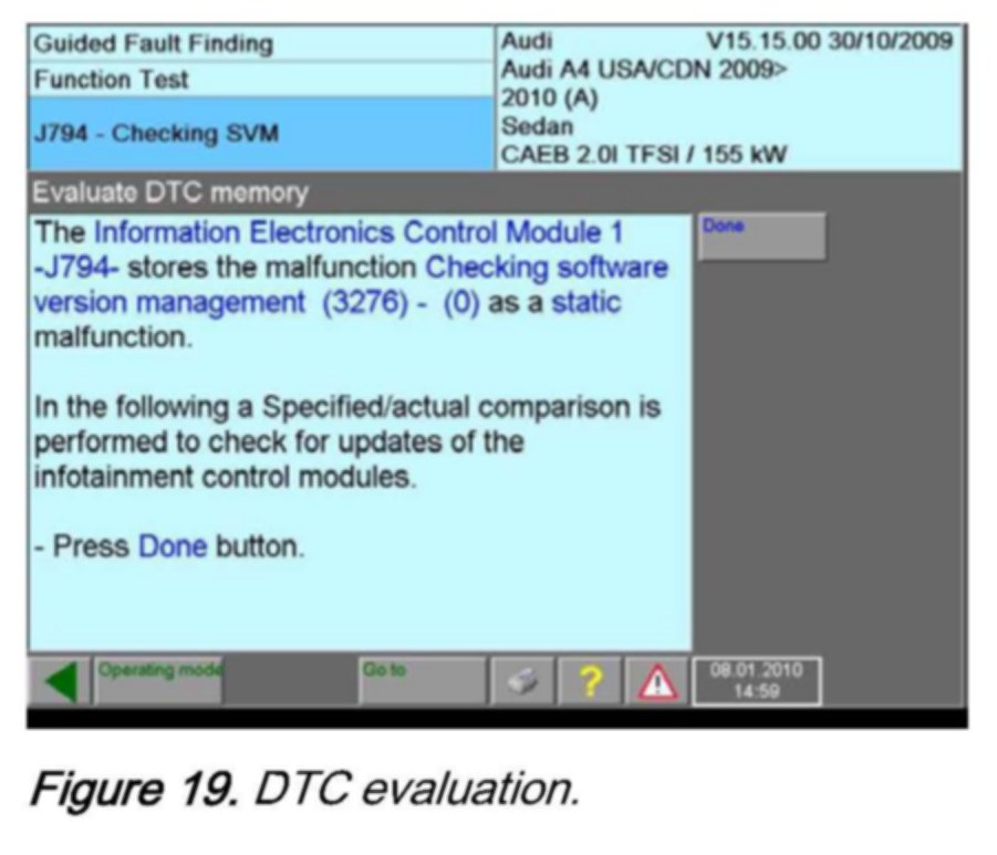 24. After the restart, perform the feedback documentation. To do this, connect a VAS tester with an online connection and enter the corresponding SVM code. See attachment 3, SVM feedback. Also, refer to TSB 2011732 00 Software Version Management (SVM), operating instructions.