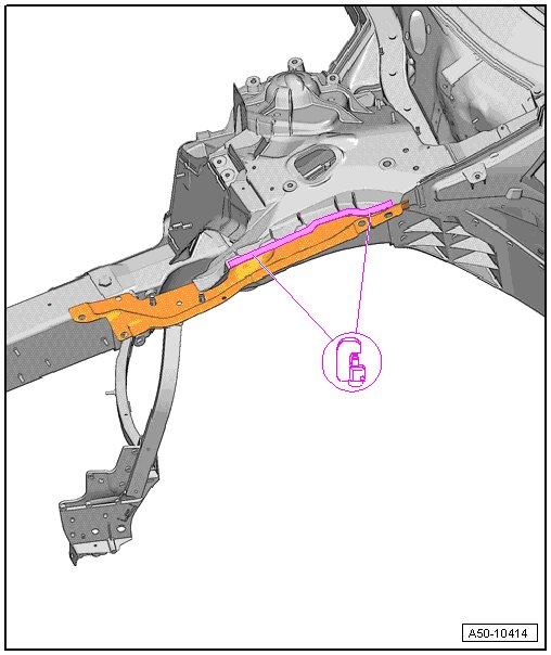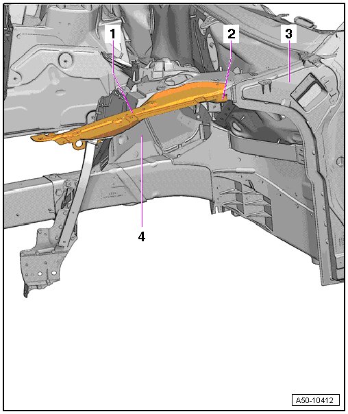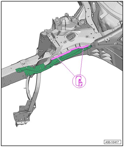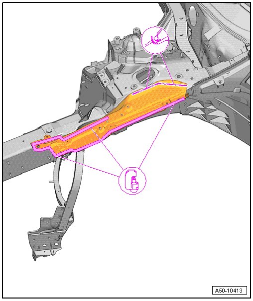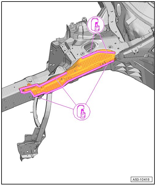 - Rivet the bottom of the fender flange to the cast joint on the suspension strut tower mount using (VAS 5279A).