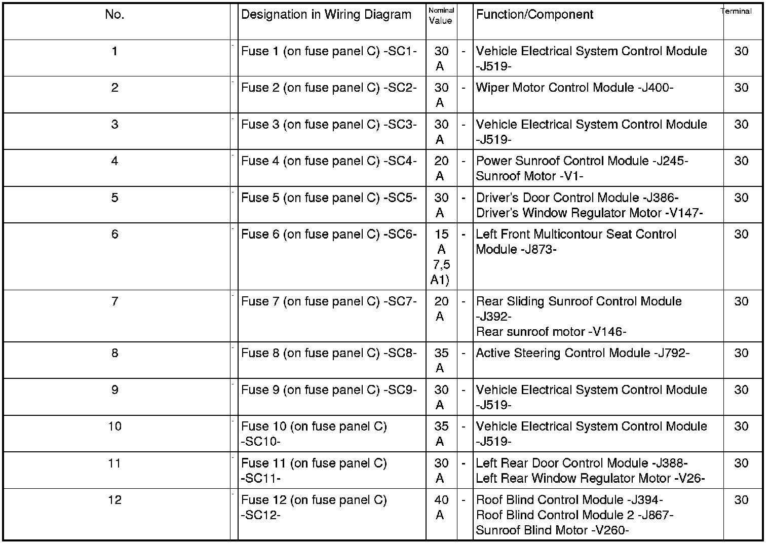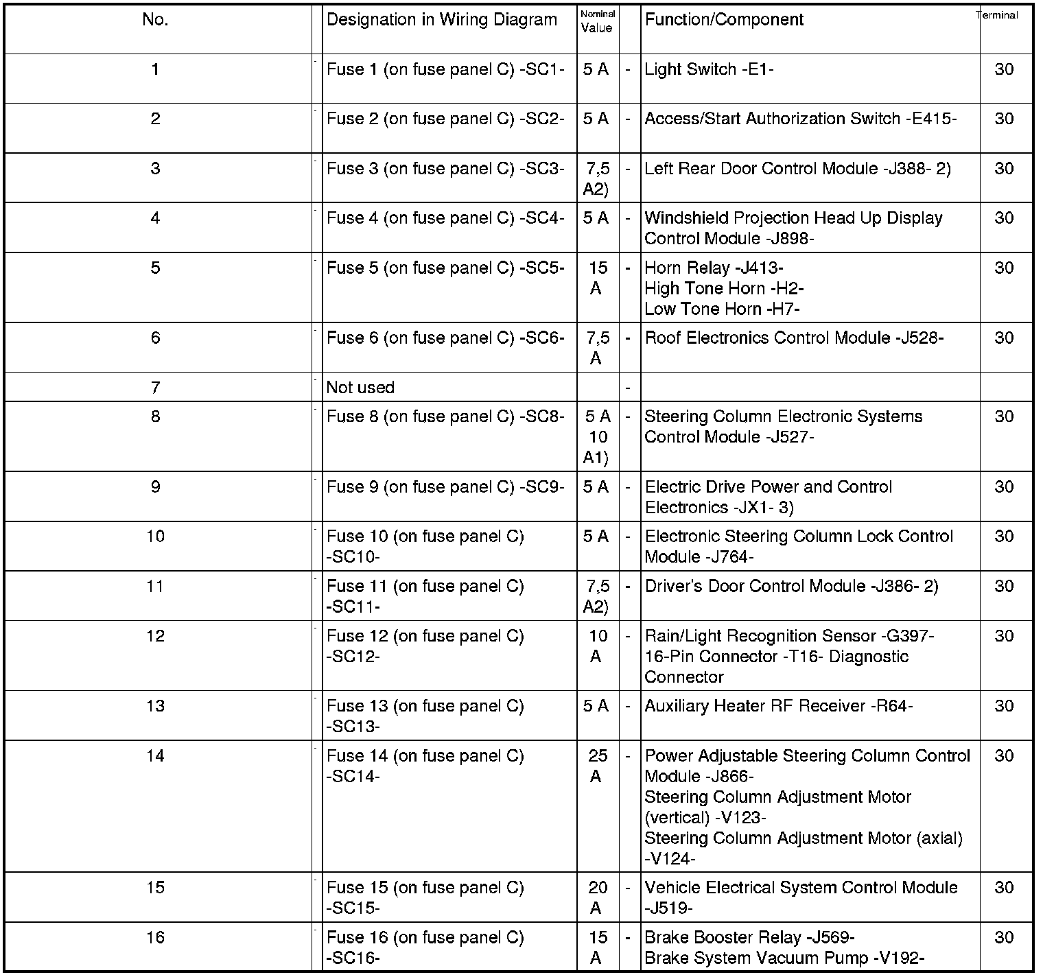 Fuses (SC) on Fuse Panel C, Left-Hand Drive