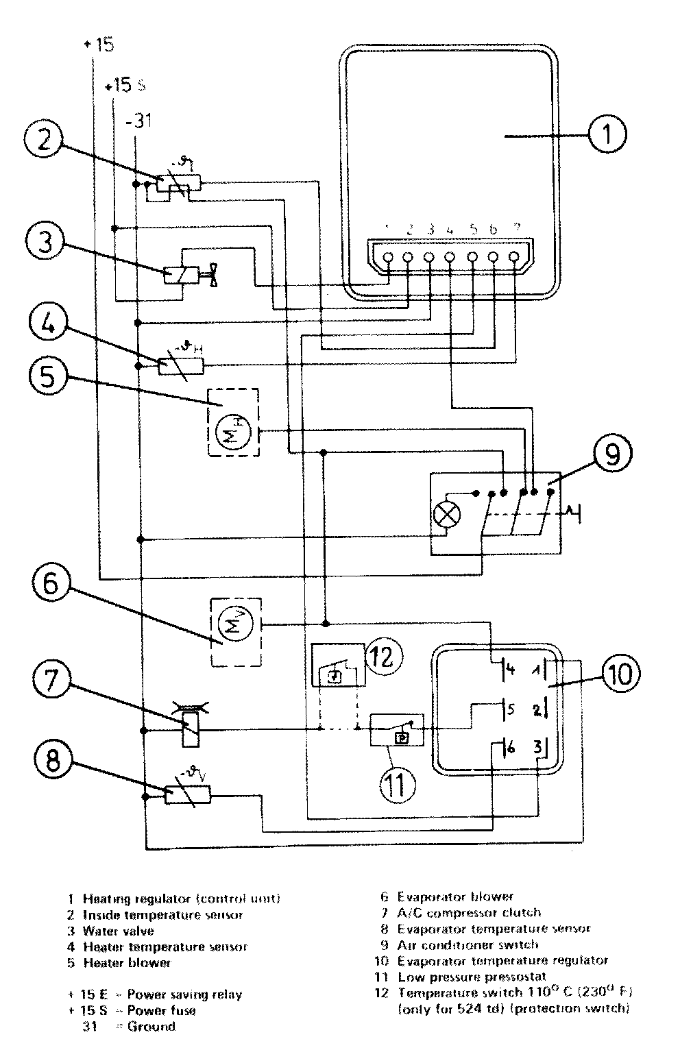 The heating and evaporator temperature regulation corresponds with the previously described heating regulation when the air conditioner is switched off. Heating regulation and the heater blower do not work when the air conditioner is switched on.