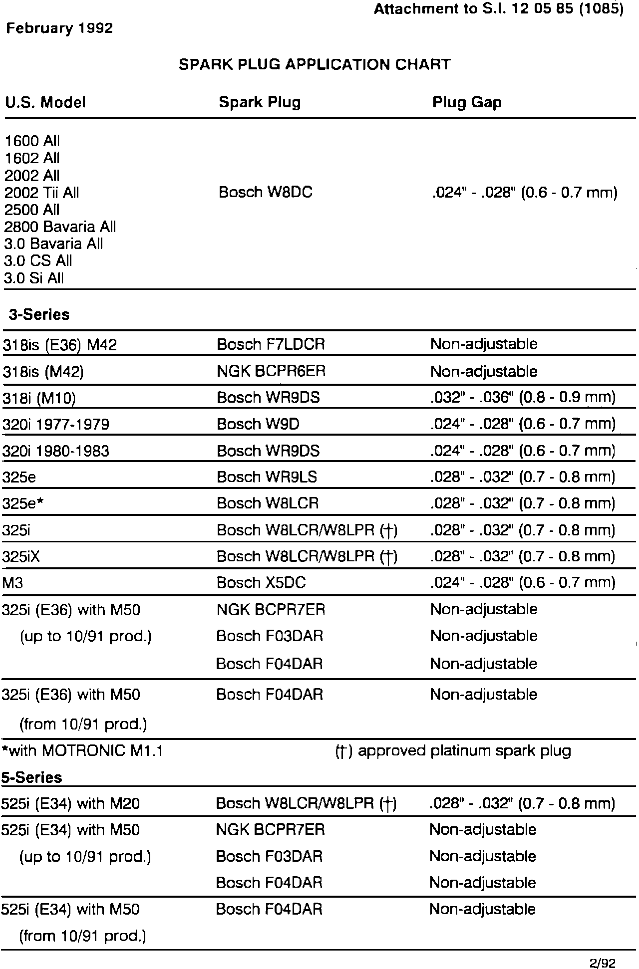 Please remove and discard the Spark Plug Application Chart (dated January 1992) from S.I. 12 03 85 (1085) and insert the chart dated March 1992 in its place.