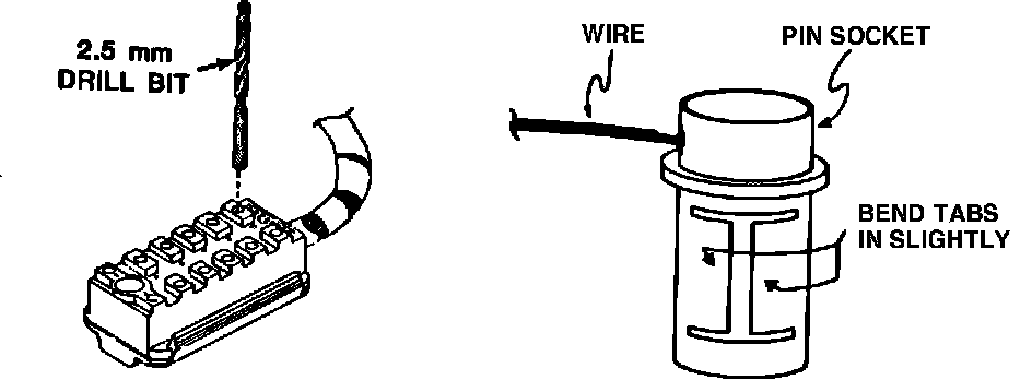 Using a 2.5 mm (#40) drill bit, check for a snug fit of the female pin sockets. If any loose pin sockets are found, remove the back half of the connector block (keeping in mind the original locations of the pin sockets). Remove the female socket pins and slightly bend the tabs of the pin sockets as shown in the sketch below.
