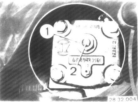 Loosen nut (1) on steering gear and turn adjusting screw (2) until specified friction torque is reached while passing the pressure point.