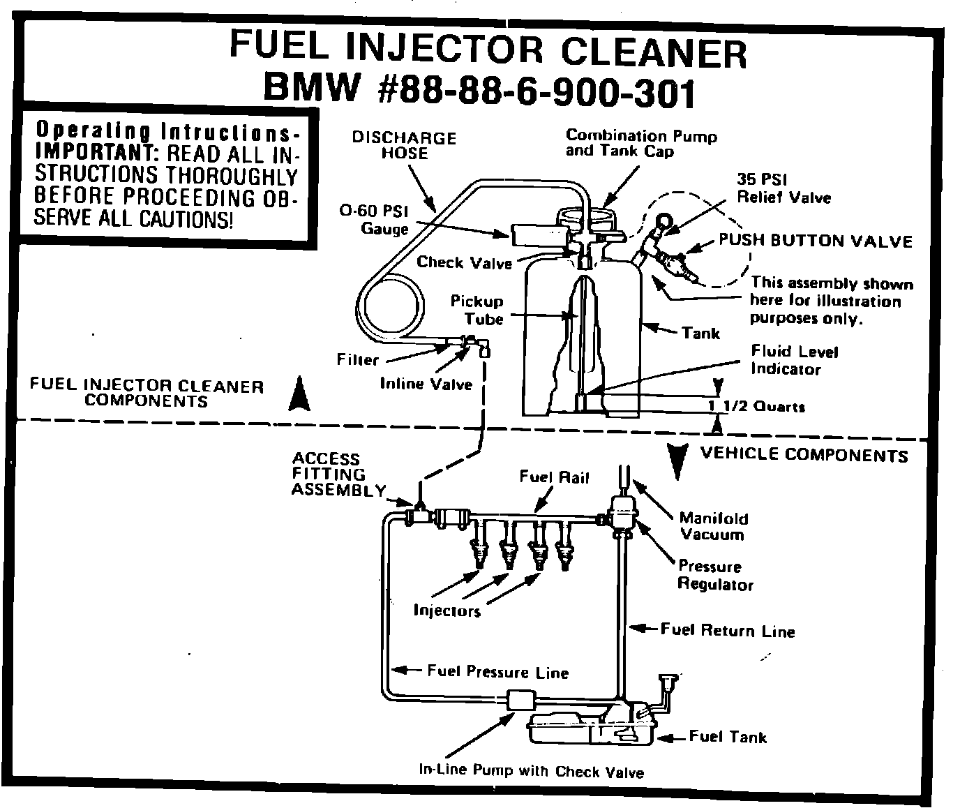 8. Add 3 ounces ONLY of Kent-Moore fuel injector cleaner to cleaner tank. Use only BMW approved injector cleaning solvent. Order direct from BMW Parts Department.