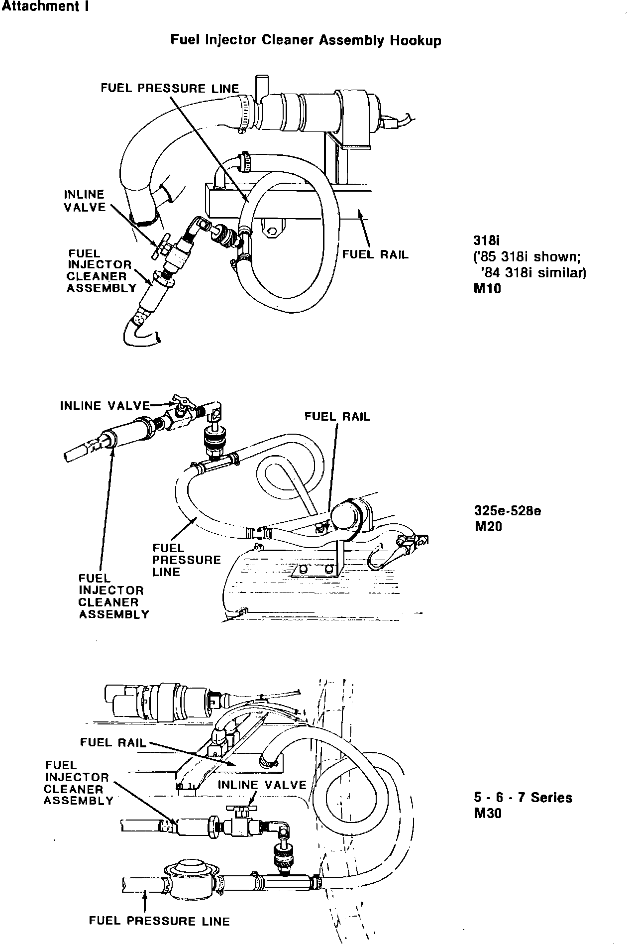 Correction: Clean injectors with injector cleaner using the procedure Outlined in this Service Information Bulletin. The instructions on the cleaner tank are issued by Kent Moore for general automotive use. Some of them may not apply exactly to a BMW. Follow the instructions from this bulletin.