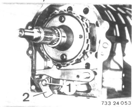 - Connect return spring (1) in bore (2) 0f parking lock pawl.
