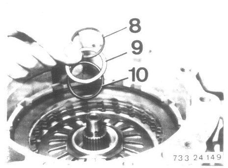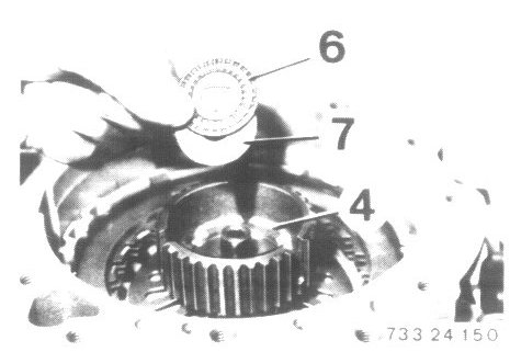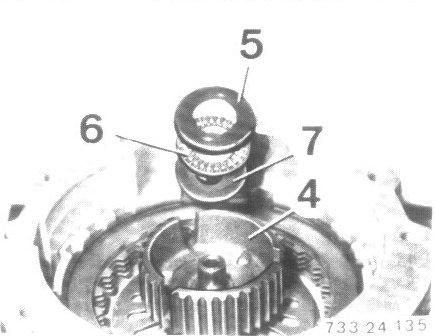 - Remove plate carrier (4) for clutch A with angled washer (5) axial bearing (6) and thrust washer (7).