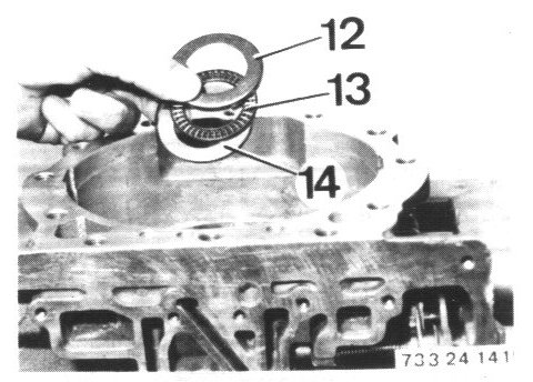 - Remove angled washer (12), axial bearing (13) and thrust washer (14).
