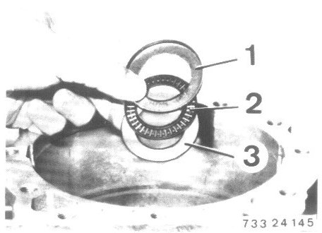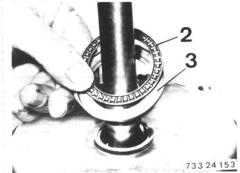 - Remove angled washer (1) axial bearing (2) and thrust washer (3).