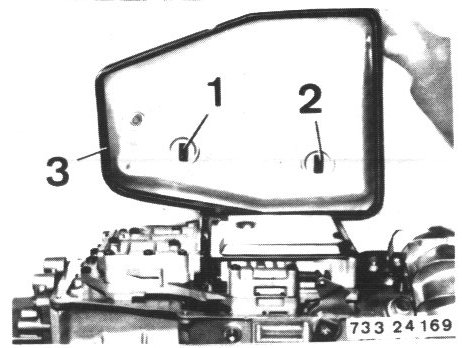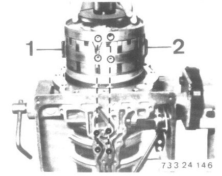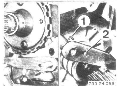 - Loosen screw (1) enough with Special Tool 00 2 100 that bracket (2) can be folded down.