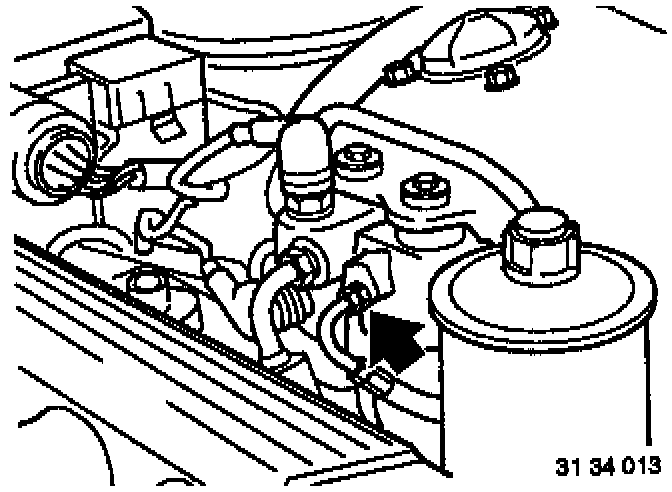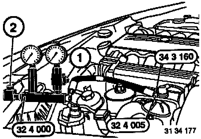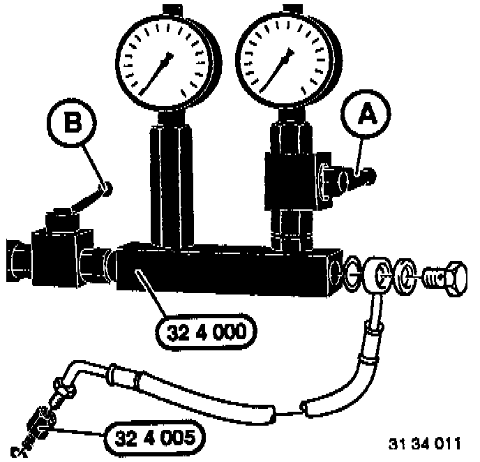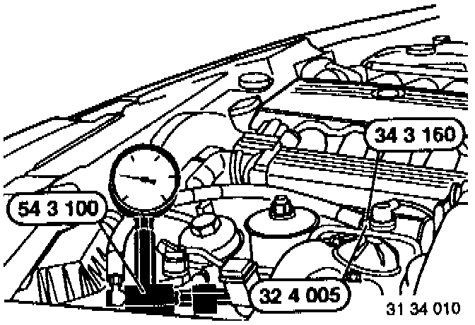 - Connect pressure tester 32 4 000 or alternatively 54 3 100 on Special Tools 34 3 160 and 32 4 005.