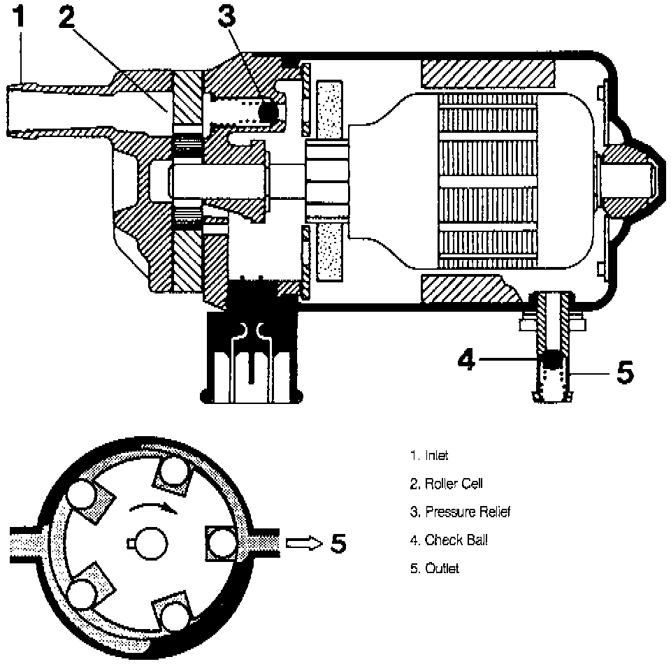 The fuel pump is a roller cell type driven by a permanent magnet electric motor. The metal rollers are fitted to an eccentrically mounted rotor plate Centrifugal force causes the rollers to be pressed against the pump housing. Fuel is carried in the cavities formed by the rollers.