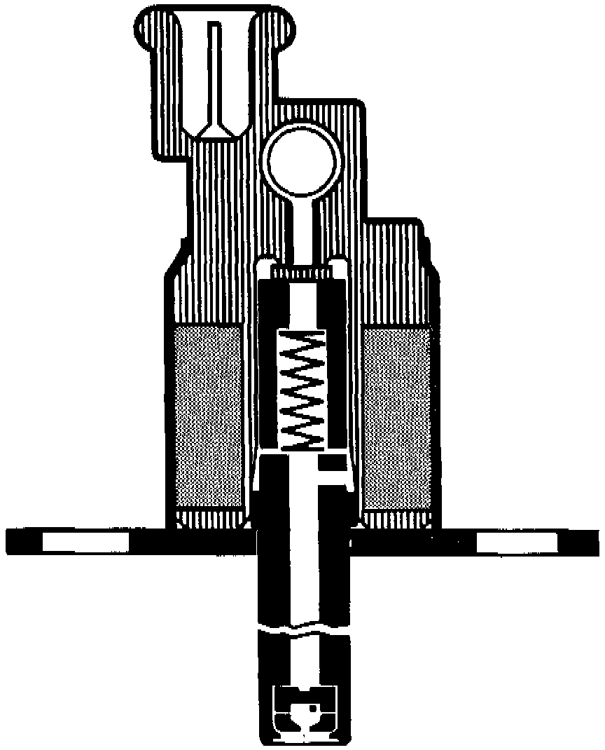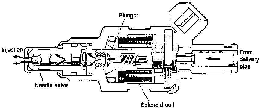 The valves are electromagnetic solenoid type valves. The valve body contains the solenoid winding needle valve and return spring. The valves are opened by electric pulses from the control unit. The amount of fuel injected depends on the opening time of the injector. The end of the needle valve is designed to atomize the fuel as it is sprayed into the manifold.