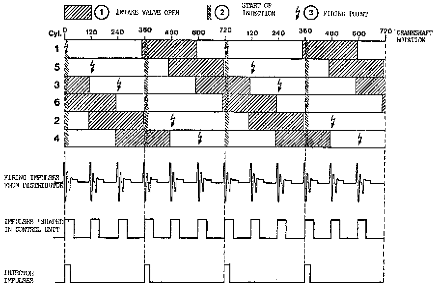 The injectors are pulsed once for each rotation of the crankshaft, or twice per working cycle of each cylinder. All injectors are opened at the same time.