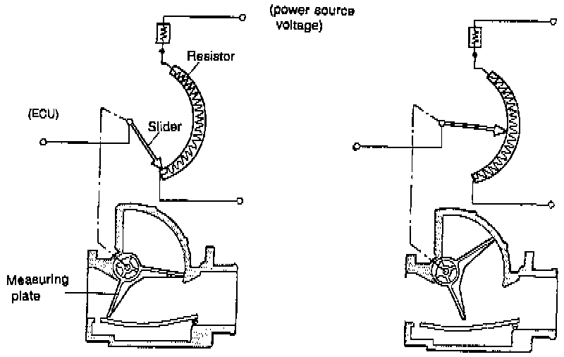 The air flow meter consists of a sensor flap compensation flap, idle bypass, potentiometer and intake air temperature sensor. It measures the volume of intake air entering the engine and converts it to a voltage signal. This voltage signal is used as an input signal to the control unit. It becomes one of the main measured variables used in determining the fuel injection amount.