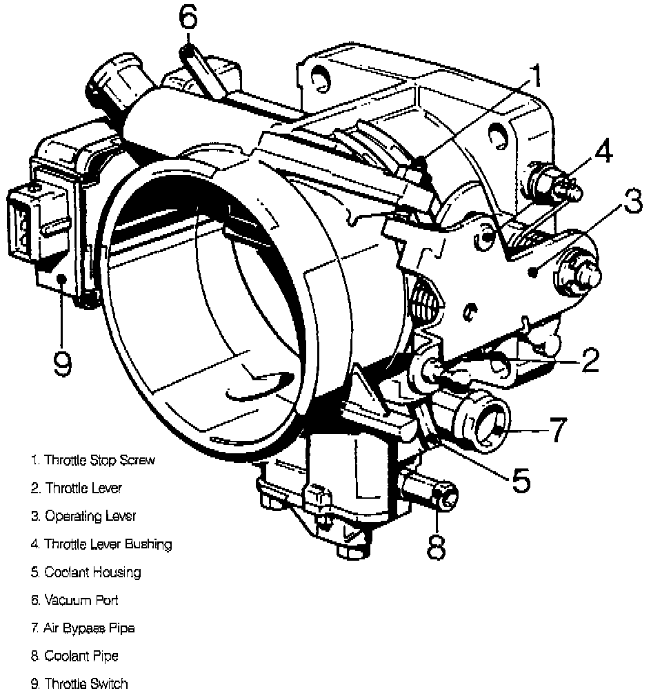 The throttle valve is connected to the accelerator pedal and controls the volume of air entering the engine. It incorporates a throttle switch to detect closed and open throttle position.