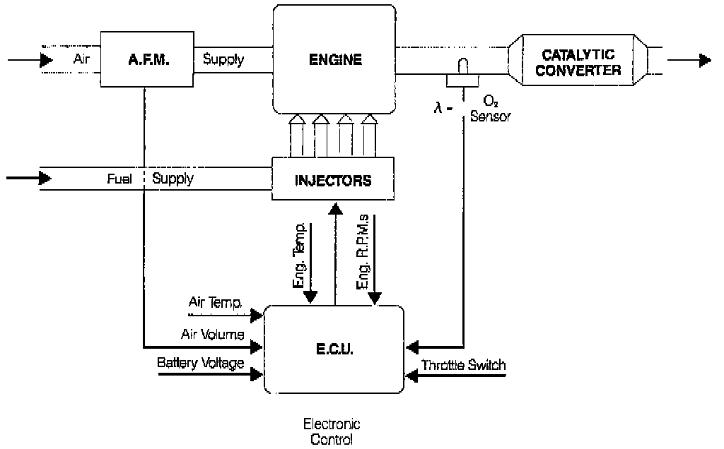 The E.C.U. bases the injection amount from various inputs that it receives from sensors located on the engine. The system can adapt rapidly to changing driving conditions and offers the benefits of improved performance and economy while reducing the level of exhaust emission.