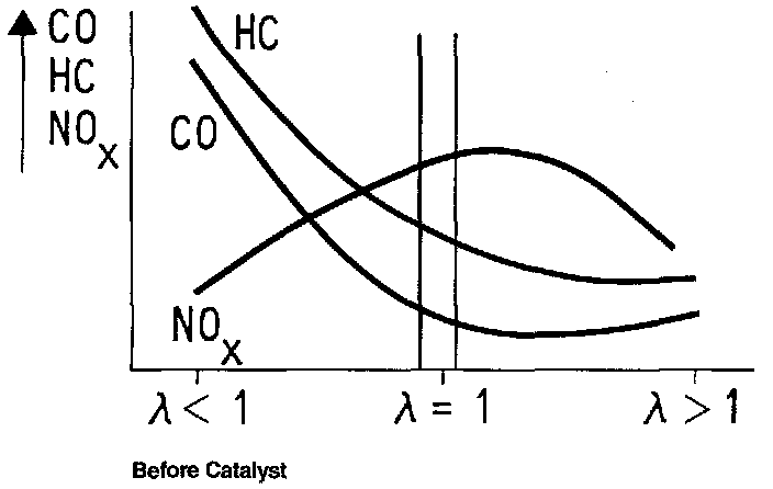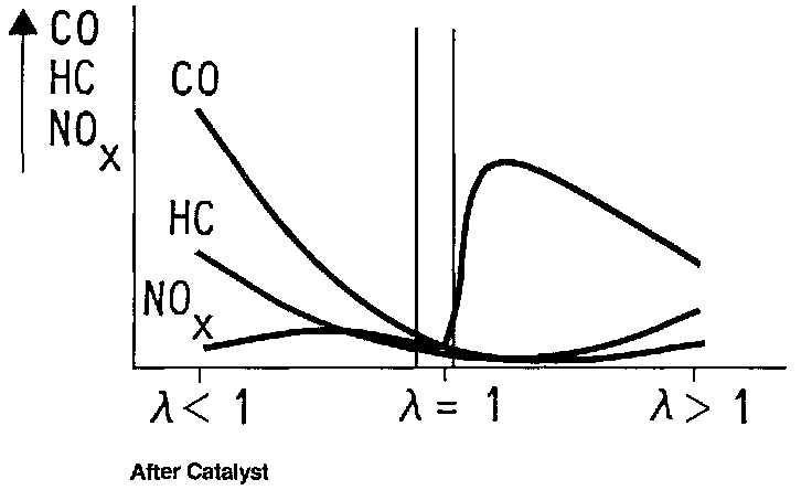 The three-way catalytic converter oxidizes HC and CO emissions into H2O and CO2. At the same time, the NOx emissions are reduced to N2 and 02. It is only efficient within the range of Lambda = 1. The graphs represent exhaust emissions with and without convertor operation. The most effective conversion occuring at Lambda = 1.