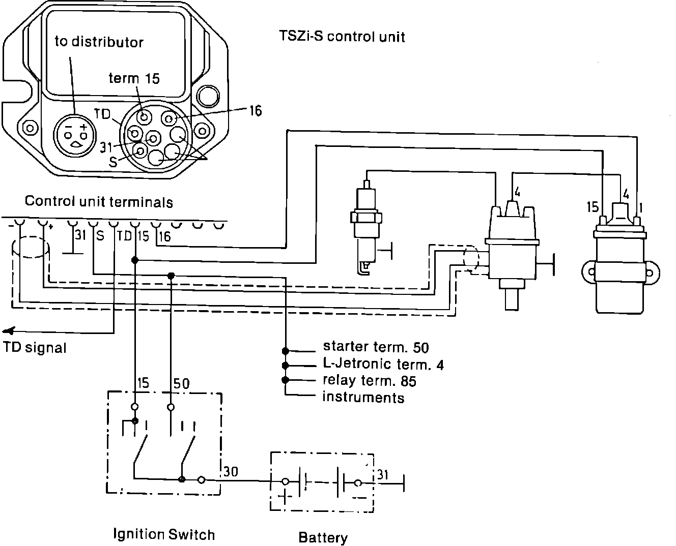 - TD (Trigger Diode) signal as a replacement of the signal from terminal 1 (of the ignition coil) for activating the tachometer or L-Jetronic control unit.