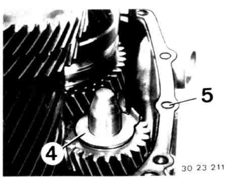 - Hold thrust washer (4) with angle facing bore (5) in case rear section on reverse gear shaft with grease.