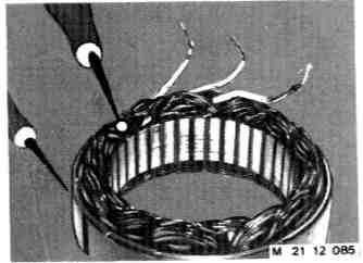 Stator Coil Ground Contact Test:- Hold test leads for resistance tests on soldering point and stator (coil carrier).
