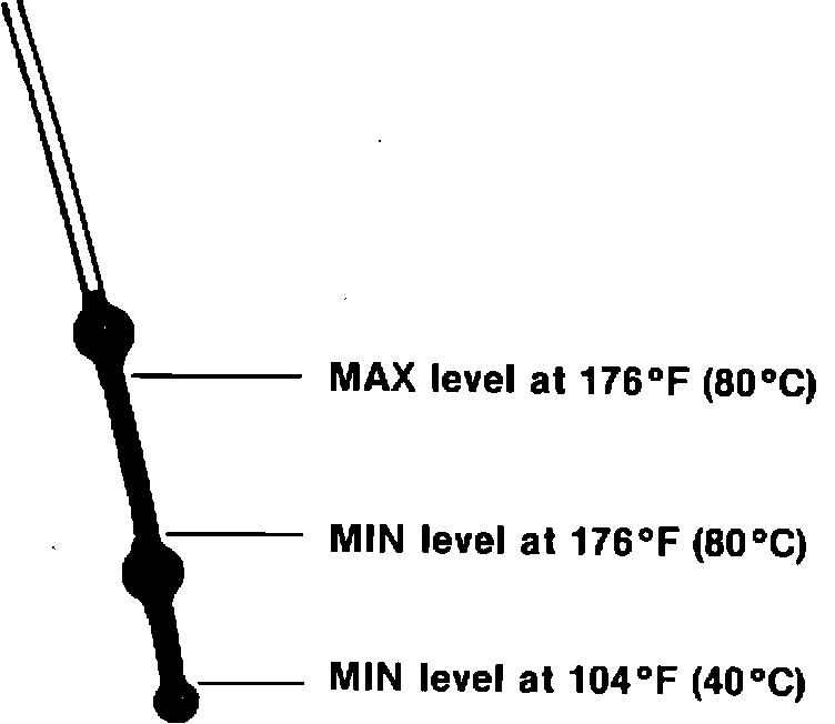 At a fluid temperature of 176~F (80~C), the reading on the dipstick should be between the two upper beads. This temperature is reached after approx. 12 miles (20 kilometers) of fast driving.