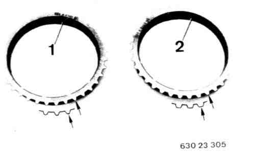 Synchromesh ring (2) for 2nd, 3rd, 4th and 5th gears: wide teeth.