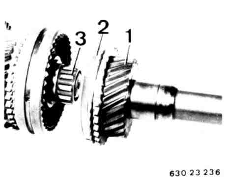 - Pull off input shaft (1), brass synchromesh ring (2) and needle bearing (3).