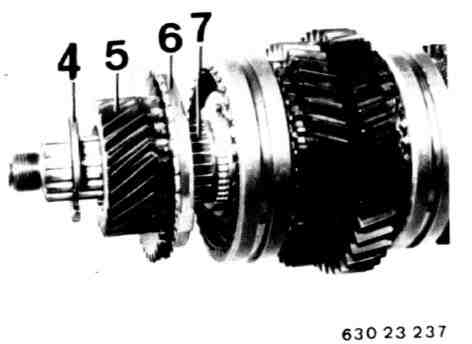 - Pull off thrust washer (4), 5th gear (5), brass synchromesh ring (6) and needle bearing (7).