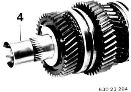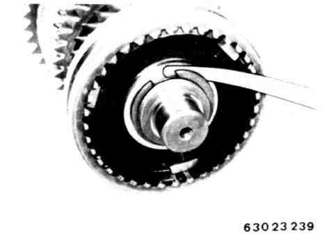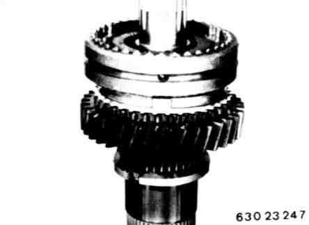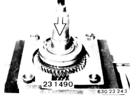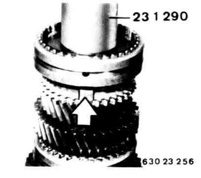 - Press off 1st gear with guide sleeve and sliding sleeve with Special Tool 23 1 490.