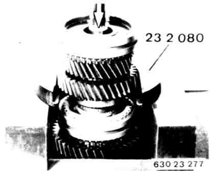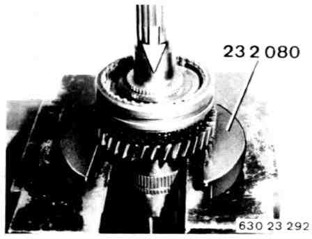 - Press off guide sleeve with operating sleeve and reverse gear with Special Tool 23 2 080 that the bottom faces the gear wheel.