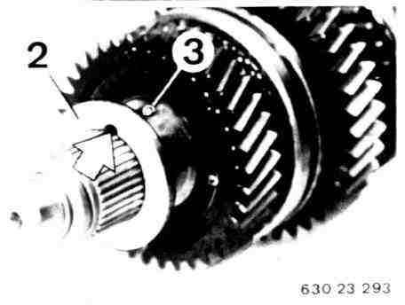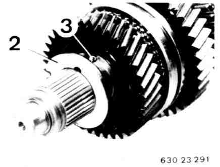 - Note thrust washer (2) and ball (3) between 2nd and 3rd gear wheels.