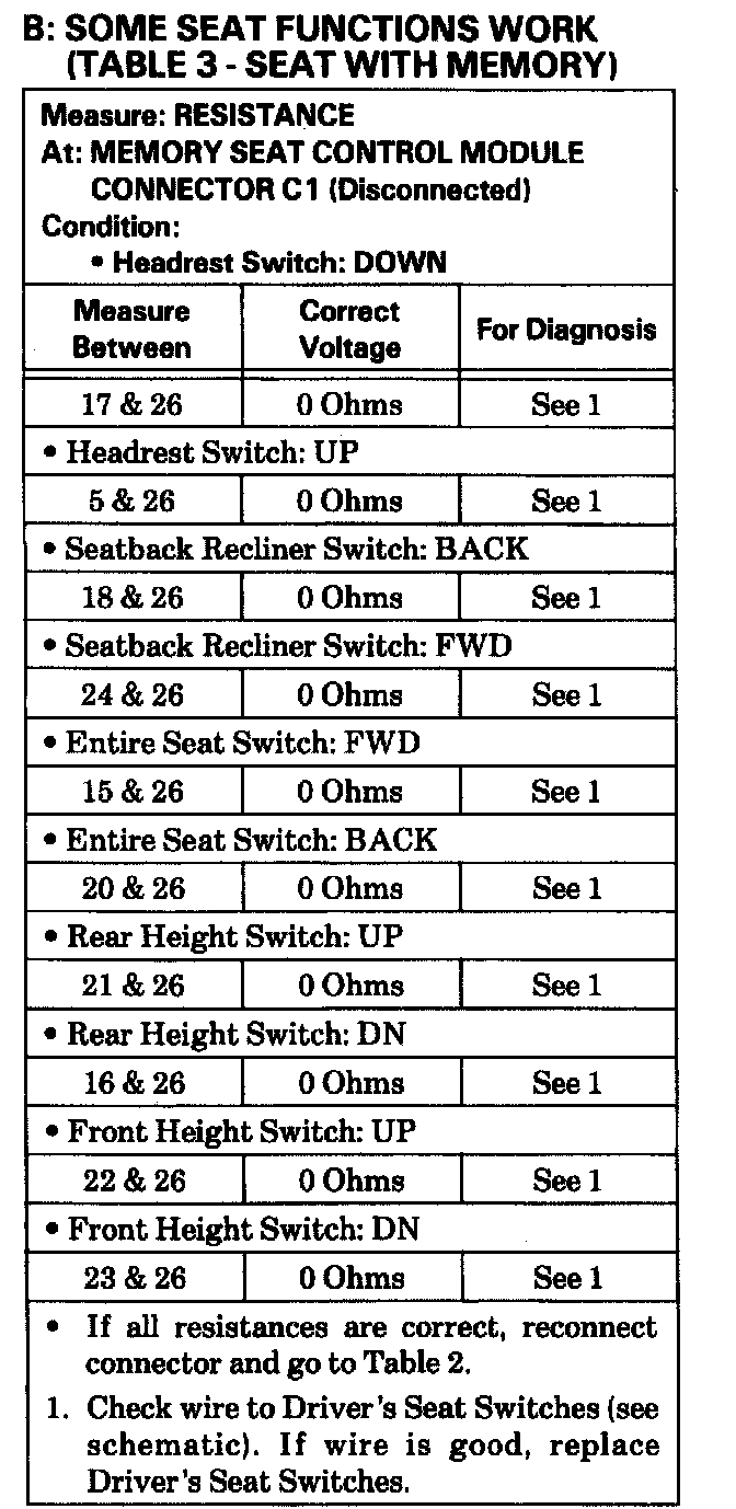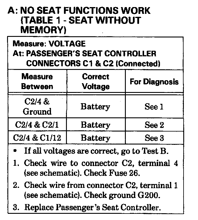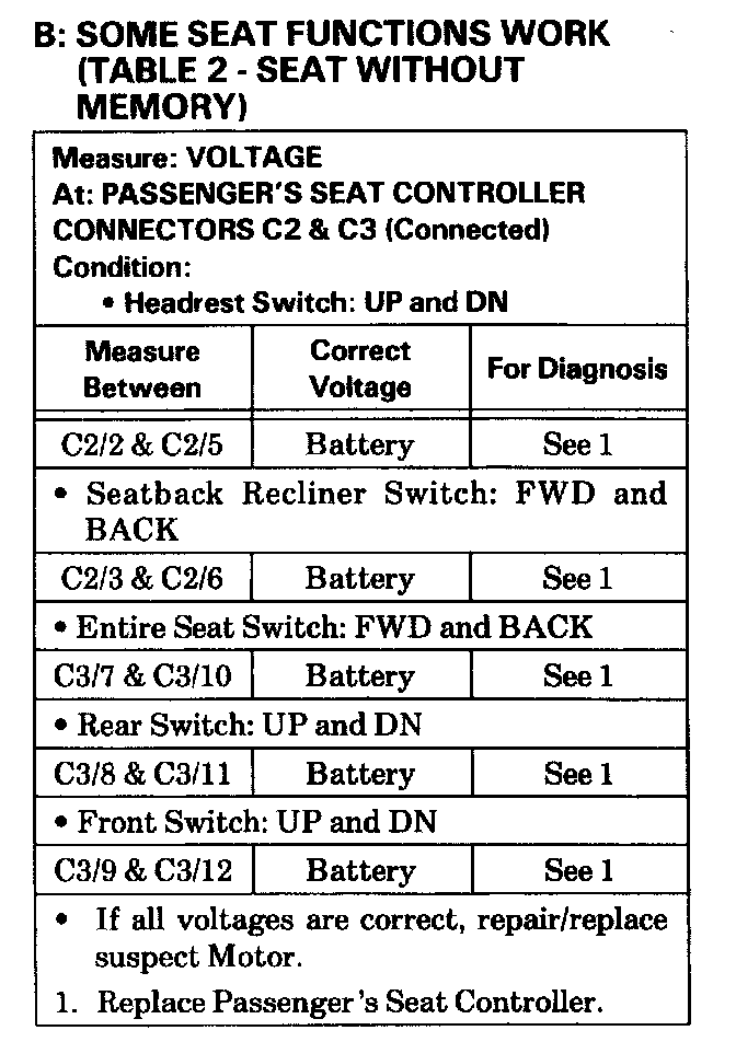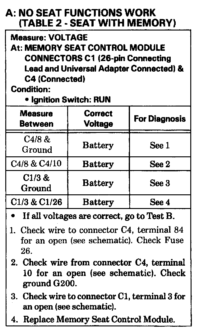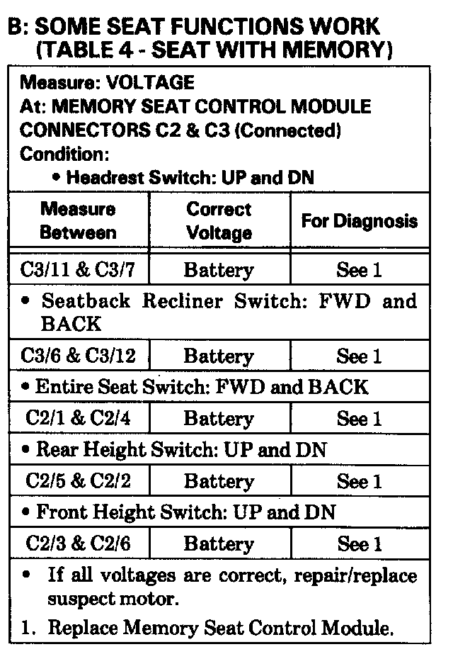 1. If both Power Seats do not operate, check Fuse 4 and the power lead to the splice.