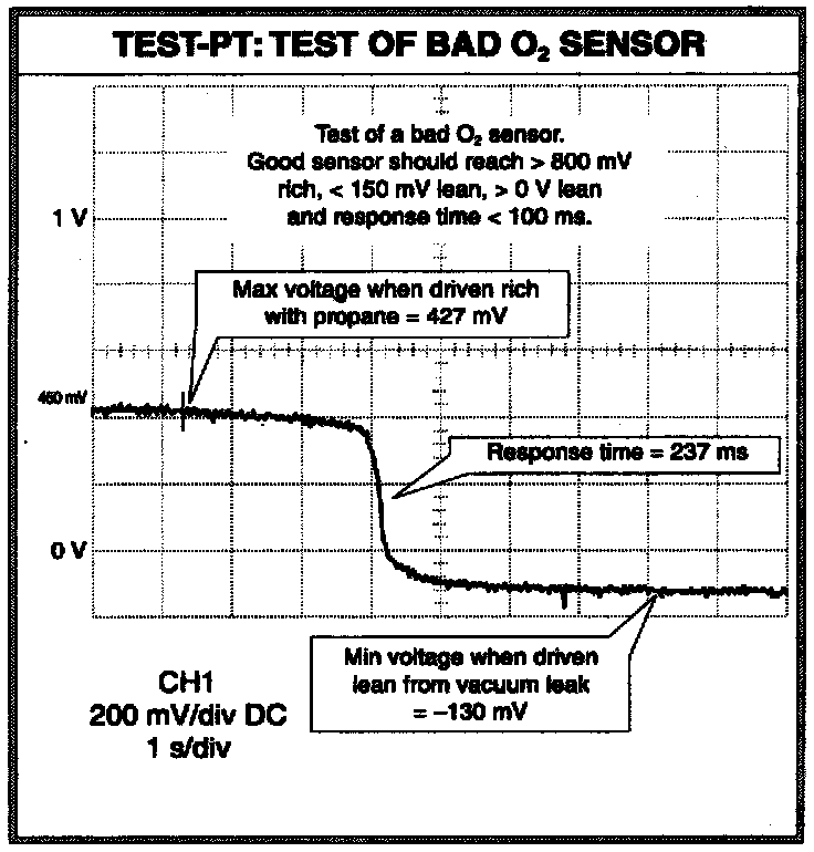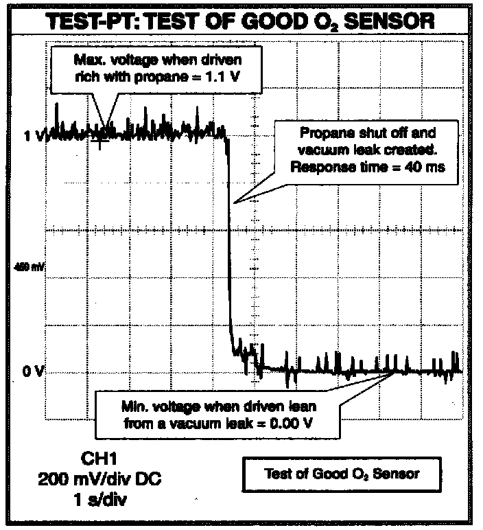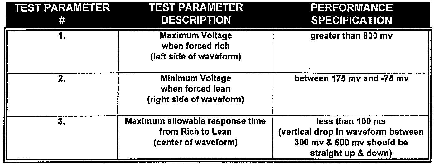 #1 For the sensor to be good, the above specifications must all be met when the procedure is followed exactly. If the engine idles too long before the propane is shut off and the vacuum leak is created (more than 20-25 seconds), then the sensor may cool down too much. This can lower its maximum amplitude and increase its response time, causing a possible false test failure. If the engine doesn't idle long enough before the propane is shut off and the vacuum leak is created, then the sensor's ability to maintain "Feedback Fuel Control Closed Loop" will not be tested properly. Many sensors will perform adequately when very hot (after 2-3 minutes at 2500 RPM), but will fail one or more test parameters after just 5 seconds of idling. That's why it's important for the propane enrichment portion of the test to consume 20 - 25 seconds.