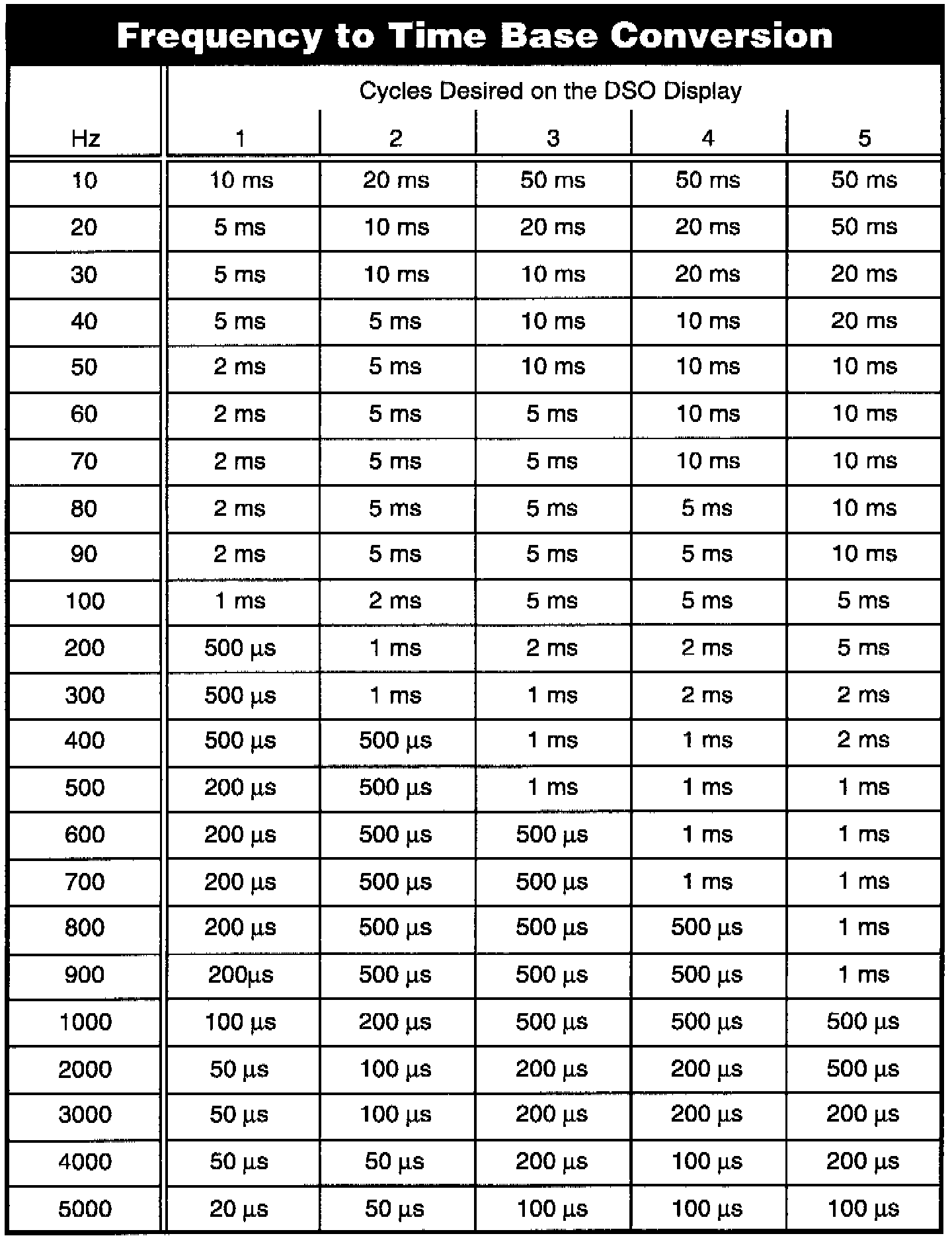 HOW TO USE THIS CHART: Determine the frequency (Hz) of the signal by using the DMM function of the DSO. Take the frequency reading from the DMM, and round off to the closest number in the left column. Choose how many cycles of the signal you want to see on the DSO display at the same time and go over to that column. That is a good time base to begin with.
