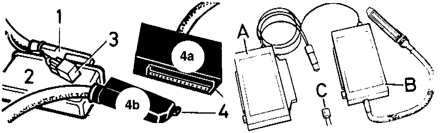 - T-plug (4b) and adapter (B) at ABS control unit (2)