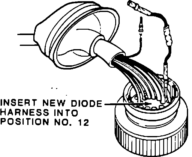 7 - Insert male end of new diode harness in vacant pin # 12 opening. Make certain that the pin locks in place. See illustration "B".
