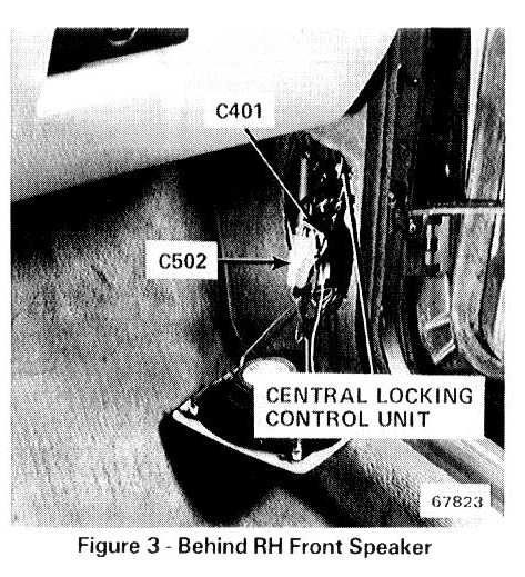 Behind RH kick panel, above speaker