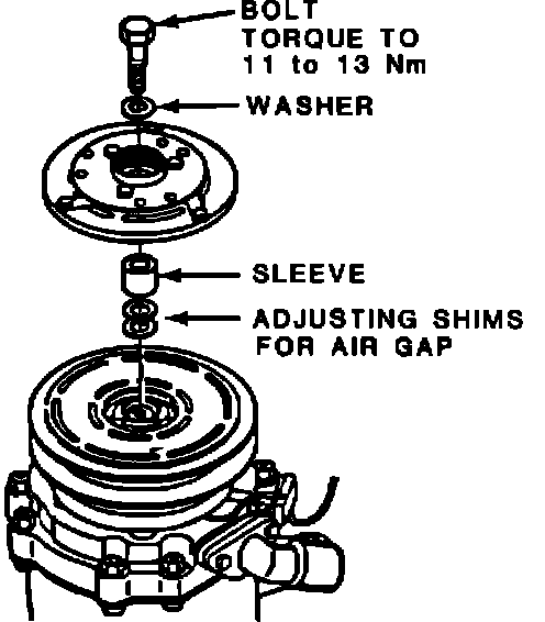9. Check air gap. The air gap between clutch disc and pulley must be between 0.3 and 0.6 mm. It can be adjusted by using shims of different thicknesses.