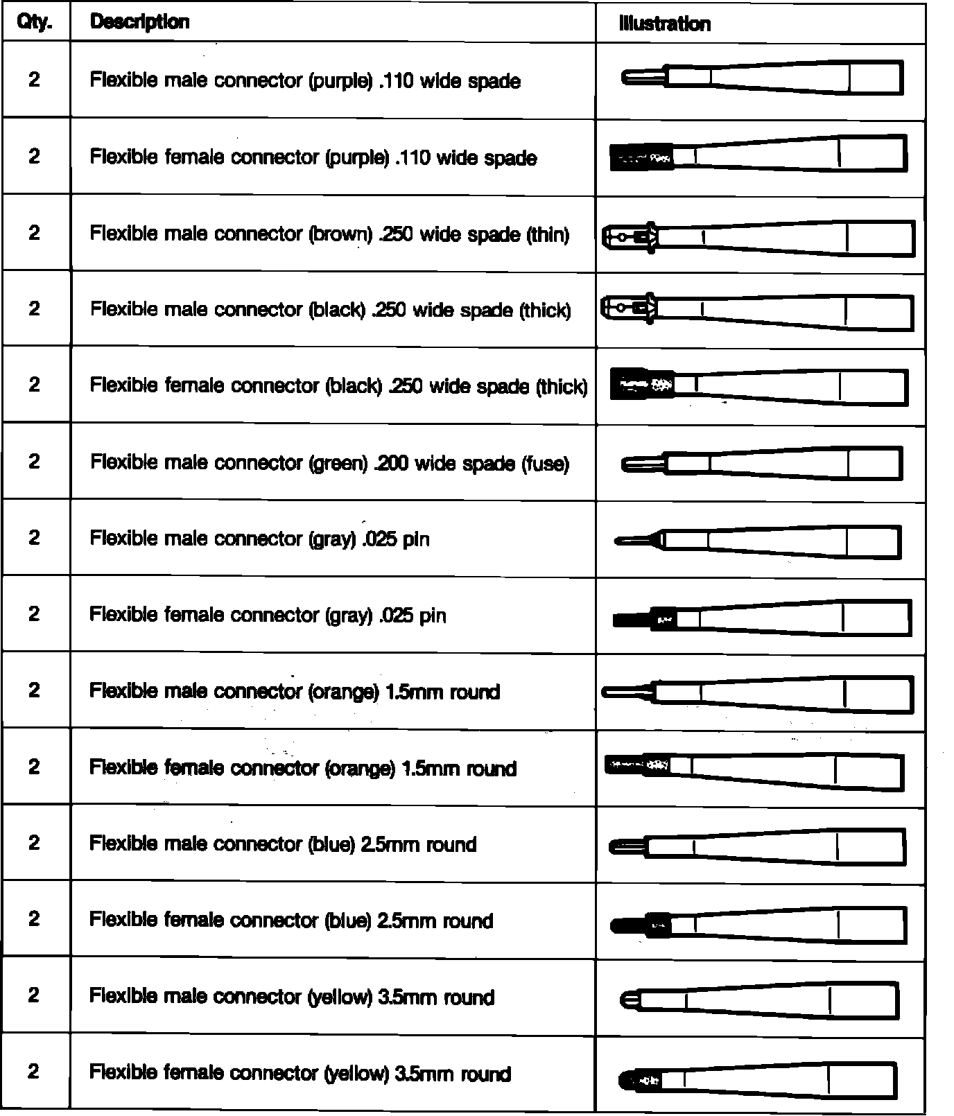 - Color coded; male and female connectors of the same size are of the same color for easy identification.