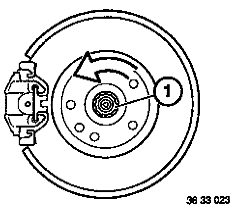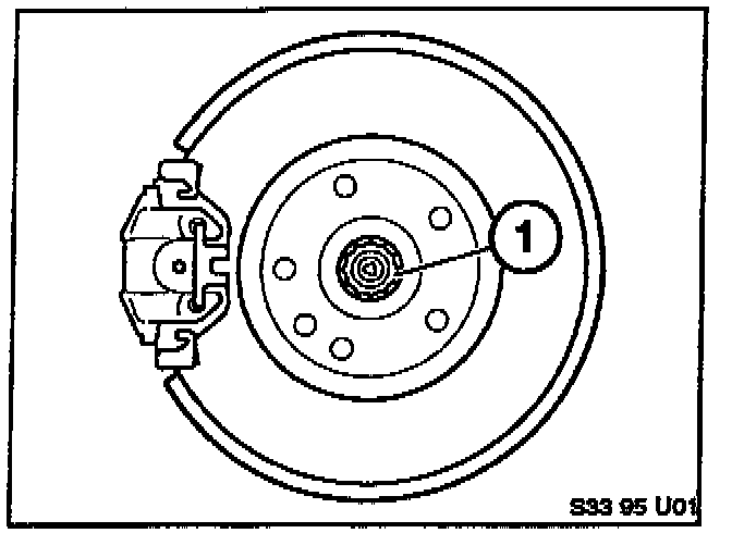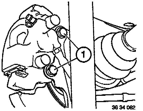 Remove caliper mounting bolts (1) and hang caliper out of the way on a piece of wire.