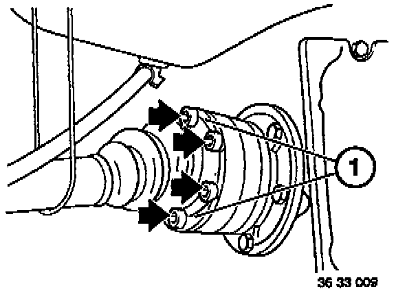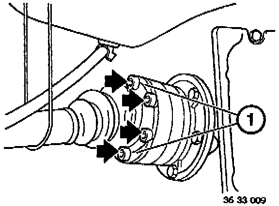 Fasten half-shaft to output flange using new bolts and plates (1). Tighten to 100 Nm.