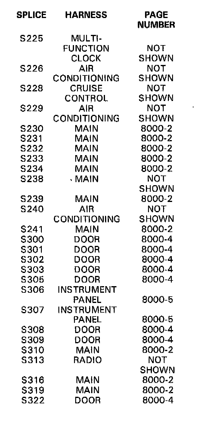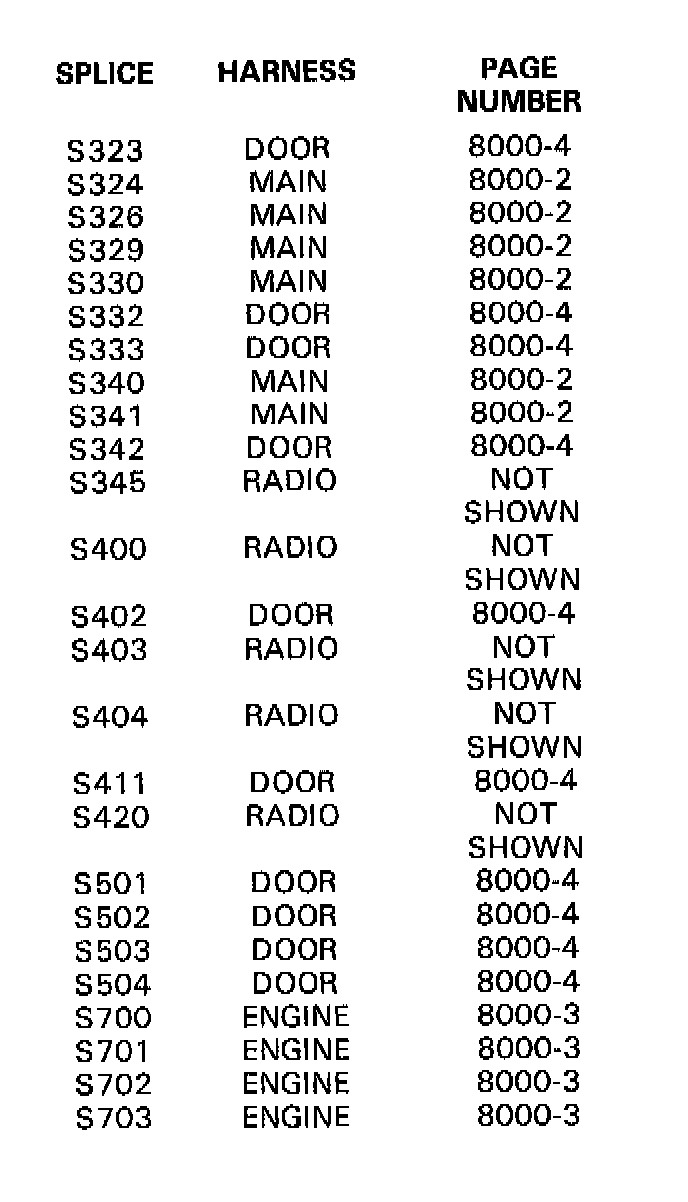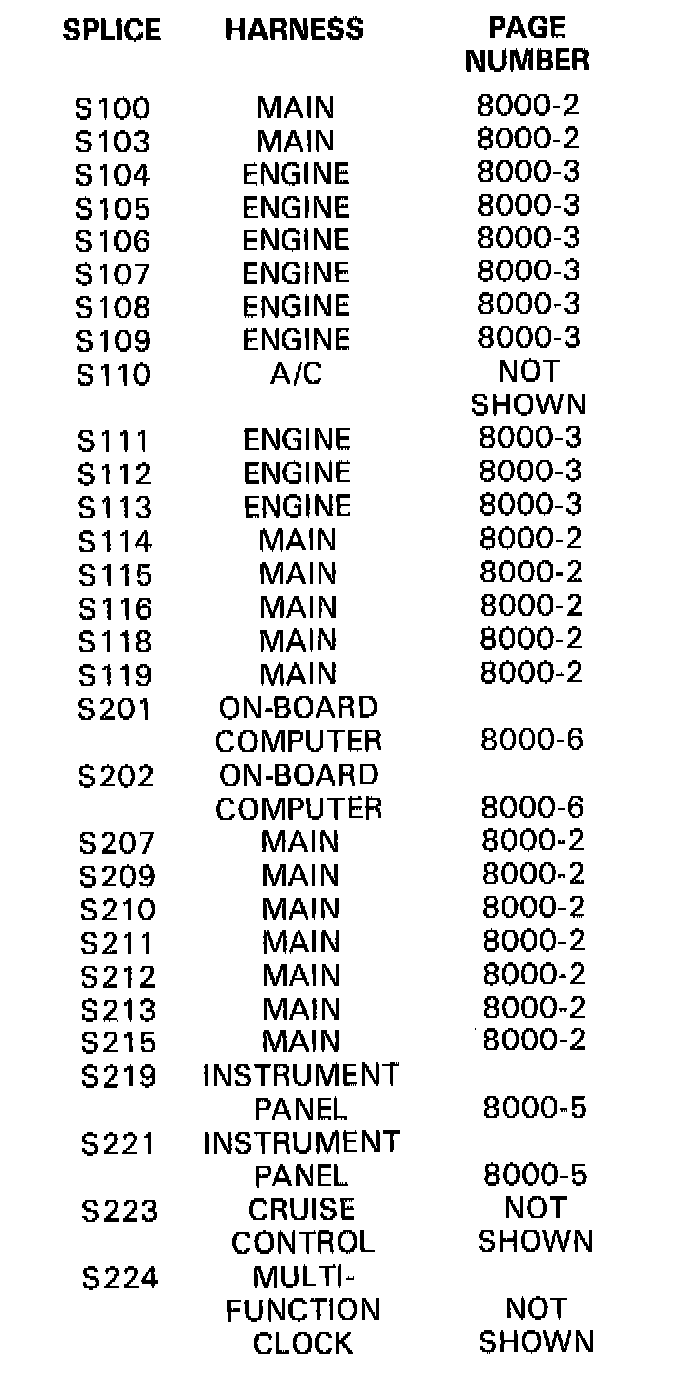 This index lists all the splices in the vehicle, the harness location of each splice, and the figure on which each splice appears. The images after the index show how the harnesses are routed through the vehicle and the location of the splices on the harnesses.