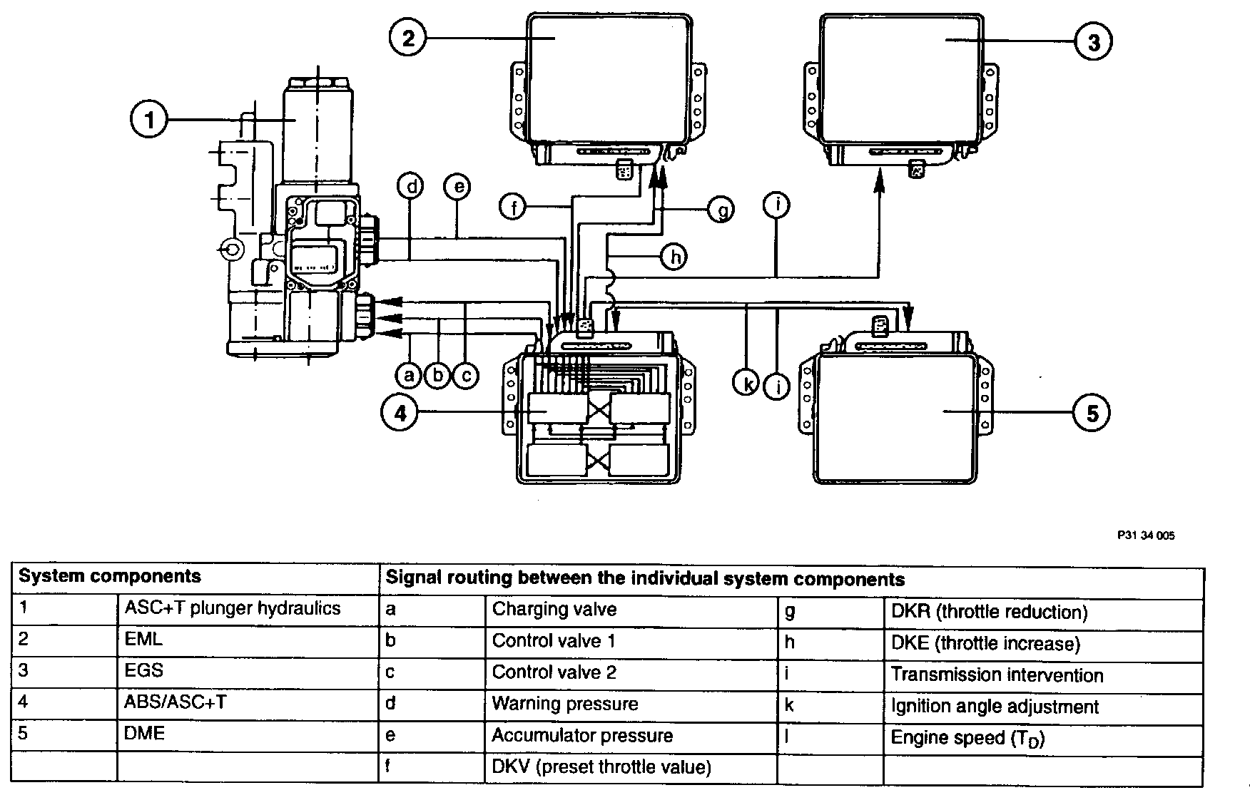 The EML constantly signals the current throttle angle (set by driver) to the ASC+T via the DKV line. If the throttle angle is to be reduced, the EML receives this information via the DKR line. If the ASC+T requires that the throttle angle is increased, engine (engine drag torque control), this information is signaled to the EML via the DKE line.