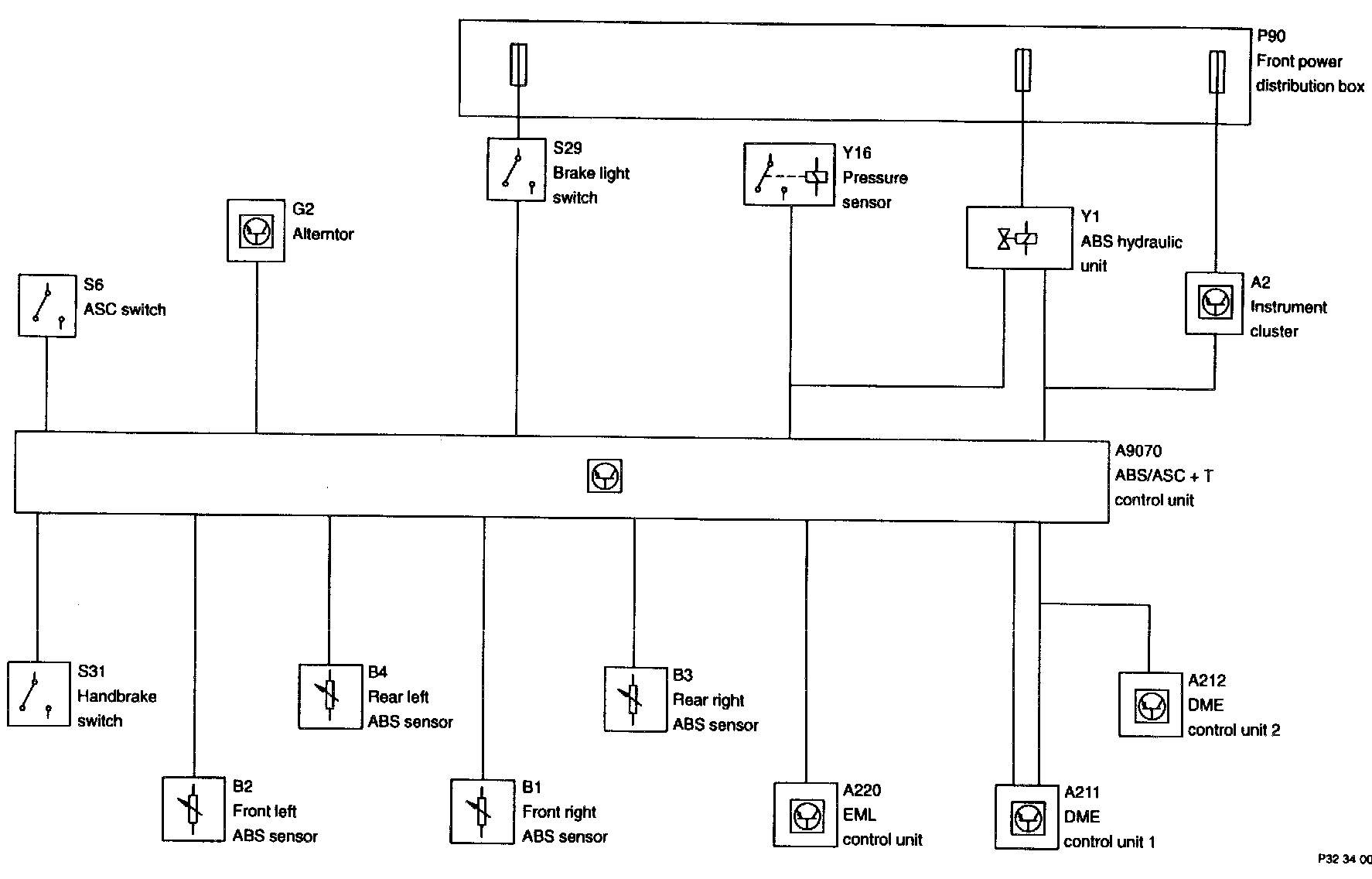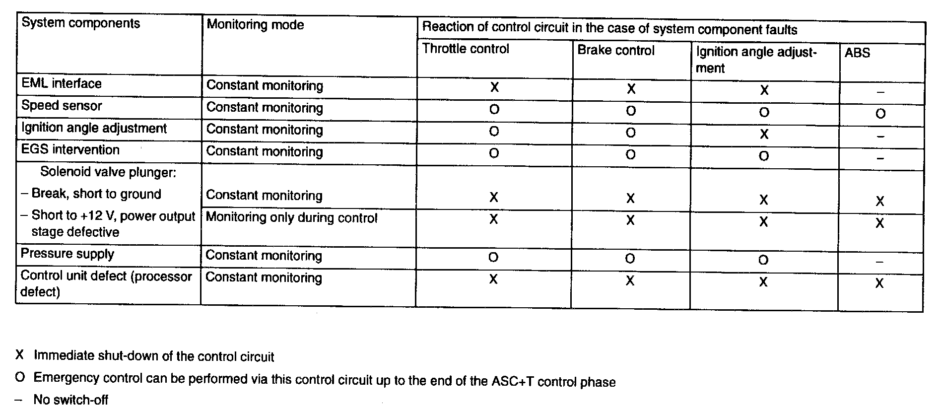 The control unit itself, as well as all components of the ASC+T system are constantly monitored for defects irrespective of the switching status of the ASC passive button. In the same way, the connections (interfaces) to other systems (DME, EML, EGS) are constantly checked or checked during a control procedure. If a fault occurs in the overall system, the ASC lamp in the instrument cluster is activated and the system switched off.. If a defect occurs during a control procedure, the control function can be completed via the intact control circuit depending on the severity of the defect. The ABS/ASC+T control unit concept allows for separate deactivation of both individual systems, whereby any ABS defect results in deactivation of the ASC+T system.